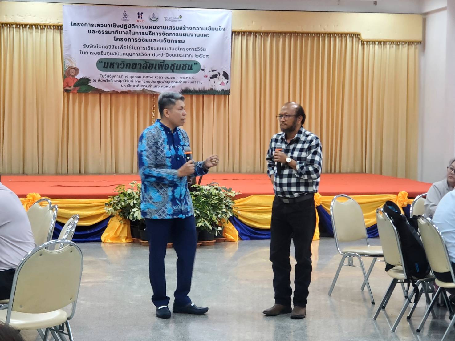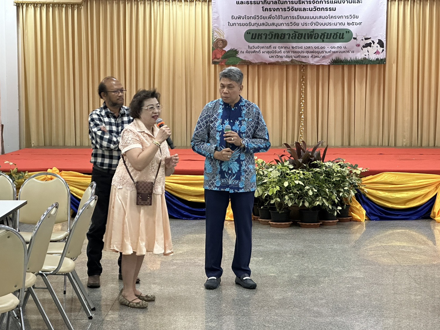 7 ตุลาคม 2568 October 7, 2025October 9, 2025 สถาบันวิจัยสัตว์ในภูมิภาคเขตร้อน มหาวิทยาลัยรามคำแหง 7 ตุลาคม 2568 ห้องศักดิ์ ผาสุขนิรันต์ หอประชุมพ่อขุนรามคำแหงมหาราช มหาวิทยาลัยรามคำแหง ขอบคุณอาจารย์ทุก ๆ ท่านที่มาร่วมกันระดมความคิด ไอเดีย และร่วมรับทราบ “แนวคิด” ที่สถาบันวิจัยและพัฒนา (สวพ.) ร่วมกับสถาบันวิจัยสัตว์ในภูมิภาคเขตร้อน (สวสร.) จะเดินไปบน “แนวทาง” ที่จะผลักดันให้มหาวิทยาลัยของเราเป็นที่รับรู้ของสังคมไทยว่าเป็น “มหาวิทยาลัยเพื่อชุมชน” ผมได้เห็นอาจารย์รุ่นใหม่ แลกเปลี่ยน เรียนรู้ร่วมกันกับอาจารย์ที่มีประสบการณ์ในการวิจัย ในบรรยากาศมิตรภาพ ไม่เป็นทางการ สนุกสนานและมี “สาระ” มาก ๆ ความร่วมมือที่มาจากต่างคณะ จะทำให้เกิดความเป็น “สหวิทยาการงานวิจัย” โดยมีสาขาวิทยบริการเฉลิมพระเกียรติของเราเป็นฐานที่สำคัญ ผลผลิต ผลลัพธ์ และผลกระทบ จะเกิดแก่ตัวผู้วิจัยเอง มหาวิทยาลัยรามคำแหง และชาวบ้านที่ส่งลูกหลานมาเรียนในมหาวิทยาลัยของเรา และอาจารย์จะได้ “เพื่อน” มากขึ้นอีกด้วย 😄 ขอบพระคุณ ผศ.วุฒิศักดิ์ ลาภเจริญทรัพย์ อธิการบดีของพวกเรา (หัวหน้าคณะเดินทาง 😄) ที่จุดประกายการวิจัยที่ให้ประโยชน์ต่อชุมชน มาตั้งแต่การสร้าง #ตลาดชุมชนฟาร์มกวาง จนกลายมาเป็นแนวทางในการ “เดินทาง” ในครั้งนี้ ผู้ที่อยู่ทั้งเบื้องหลังและเบื้องหน้าสำคัญ (แม่งาน) 😄 รศ.ดร.มณี อัชวรานนท์ ผอ.สถาบันวิจัยสัตว์ในภูมิภาคเขตร้อน รศ.ดร.จักรี ไชยพินิจ รธก. จ.แพร่ ที่สนับสนุนข้อมูลจำนวนมากอันมีค่า (ท่านมาไม่ได้เพราะต้องเข้า รพ. ขอให้หายไวๆนะครับ ☺️) ผศ.ดร.เดมีย์ ระเบียบโลก รธก. จ.นครศรีธรรมราช ให้เกียรติเป็นพิธีกรเป็นวิทยากร และเป็นทุกๆอย่างให้เรา 😄 รศ.ดร.กฤษดา ตั้งชัยศักดิ์ คณบดีบัณฑิตวิทยาลัย อ.ดร.สุรพัฒน์ มังคะลี ผอ.สำนักพิมพ์ อ.ดร.อรอนงค์ อิงชำนิ คณบดีคณะศิลปกรรมศาสตร์ ผศ.ดร.จุฑารัตน์ วรประทีป รธก. จ.สุรินทร์ รศ.พัชรดา เอื้อวรรณกิจ รธก. จ.นครราชสีมา ผศ.ดร.บงกช ทองเอี่ยม รธก. จ.ปราจีนบุรี อ.ดร.ก่อพงศ์ นามวัฒน์ รธก. จ.ชัยภูมิ อ.ดร.วีรพันธ์ แซ่ด่าน รธก. จ.นครพนม อ.ดร.พงศกร พรมสวัสดิ์ รธก.จ.ขอนแก่น อ.ทิวากร อังศุธรางกูร รธก. ฝ่ายกิจการพิเศษ อ.ดร.เกสรี พงษ์สังข์ ประธานสภาคณาจารย์ และผู้มีประสบการณ์วิจัยชุมชนมาอย่างยาวนาน (มีขนมจากชุมชนมาฝากเยอะมาก 😄) ผศ.ดร.ณีรนุช ควรเชิดชู คณะวิทยาศาสตร์ อ.ดร.วศิน ยิ้มแย้ม คณะนิติศาสตร์ อ.ภคิน อัครธีรนุภาพ คณะนิติศาสตร์ รศ.ดร.รุ่งโรจน์ ภิรมย์อนุกูล คณะมนุษยศาสตร์ เจ้าหน้าที่ของ สวพ. และ สวสร. ทุกท่าน ลุกออกมาจาก “พื้นที่ปลอดภัย” แล้วมาร่วมขบวนเดินทางไป