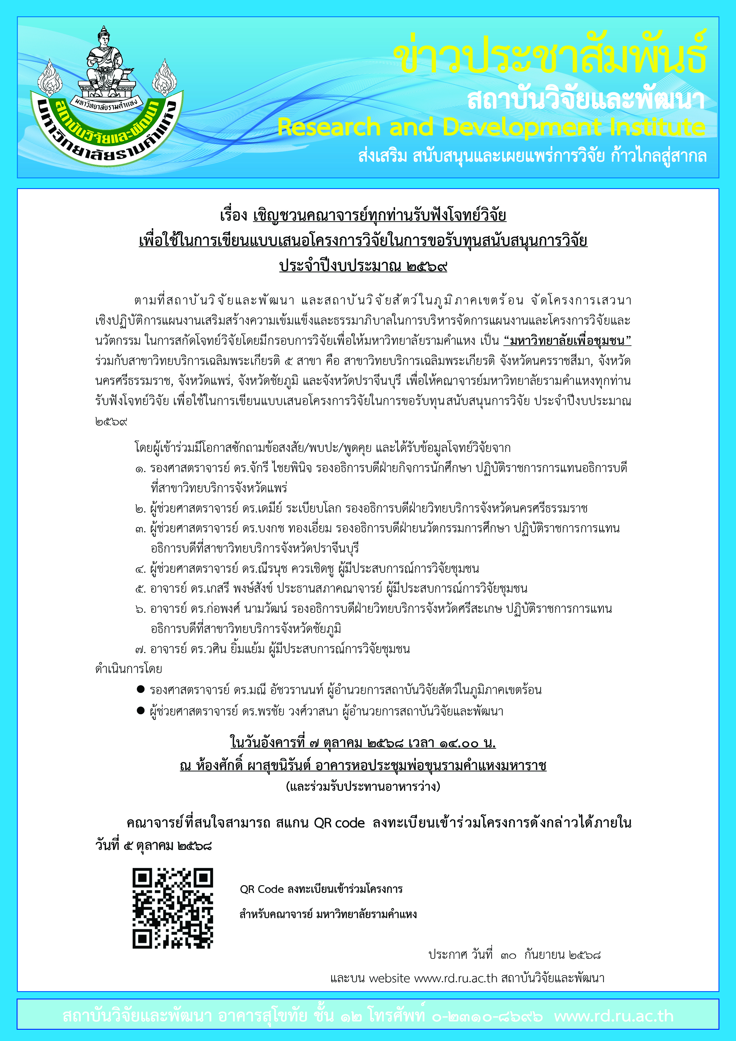 เชิญชวนคณาจารย์ทุกท่านรับฟังโจทย์วิจัย เพื่อใช้ในการเขียนแบบเสนอโครงการวิจัยในการขอรับทุนสนับสนุนการวิจัย ประจำปีงบประมาณ 2569 September 30, 2025October 1, 2025 สถาบันวิจัยสัตว์ในภูมิภาคเขตร้อน มหาวิทยาลัยรามคำแหง เชิญชวนคณาจารย์ทุกท่านรับฟังโจทย์วิจัย เพื่อใช้ในการเขียนแบบเสนอโครงการวิจัยในการขอรับทุนสนับสนุนการวิจัย ประจำปีงบประมาณ 2569